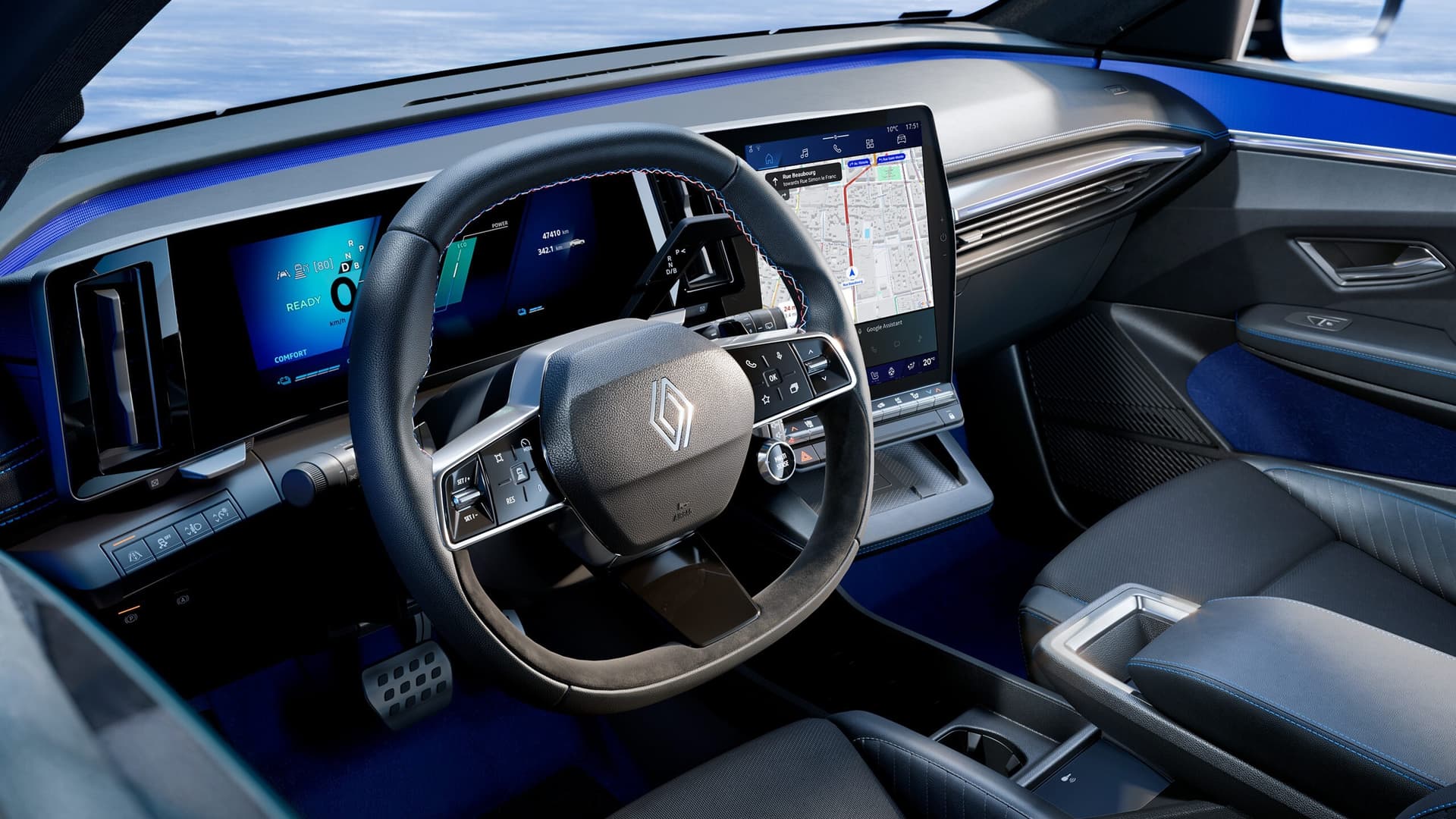 Renault Megane esprit Alpine fremhever sin sportslige karakter med en matt shadow grey-lakk, et esprit Alpine-emblem og dens unike 20" lettmetallfelger. Førermiljøet er har fått sitt preg i form av sportspedaler, polstring med blå søm og Alpine-logoen.