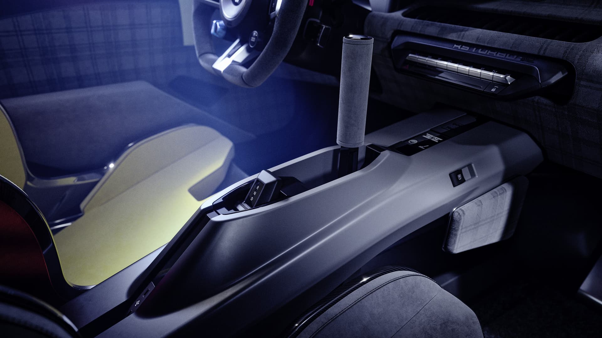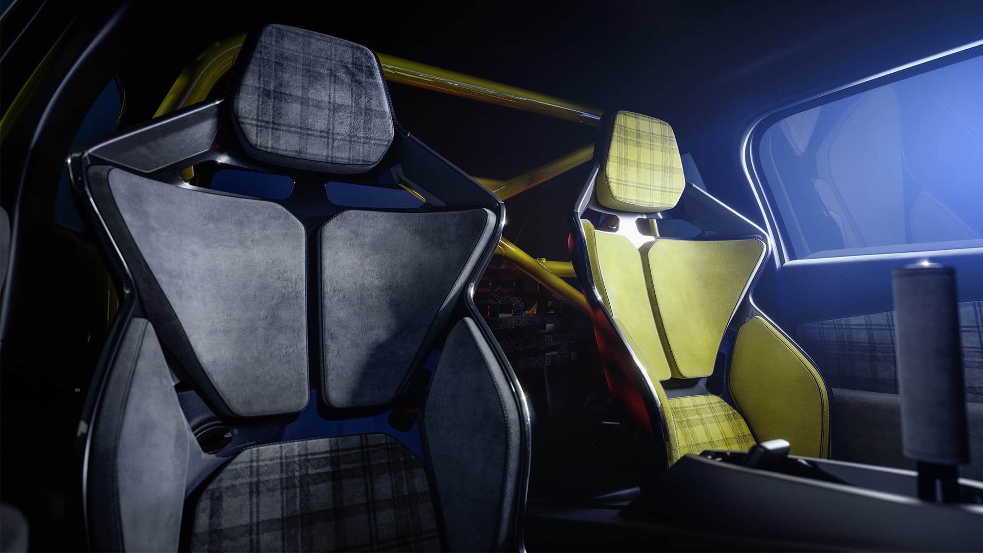 Passasjerrommet har tilpassede bøtteseter med 6-punkts seler. På racerbanen sørger den sentrale rally-håndbremsen for kontrollert drift¹ i radikale svinger. Den doble digitale skjermen på openR-skjermen sitter bak sportsrattet.