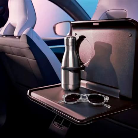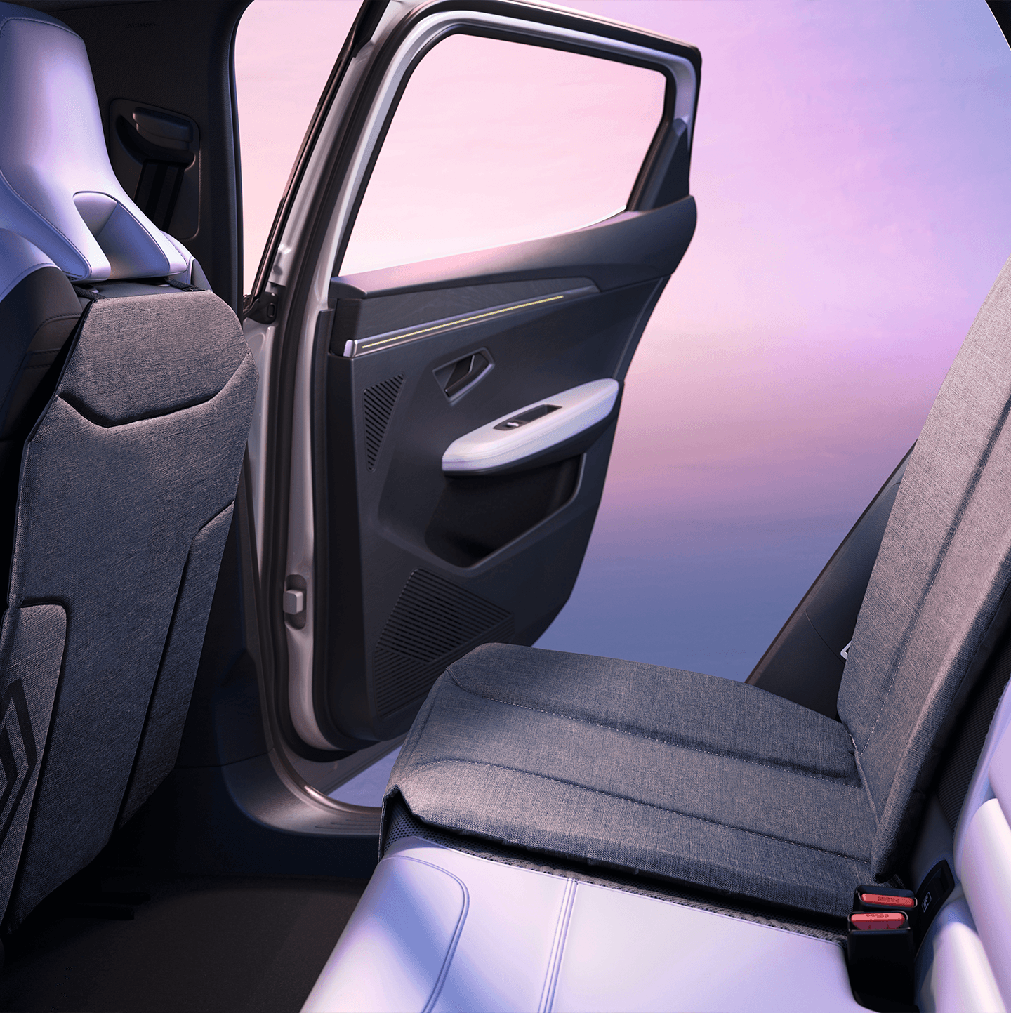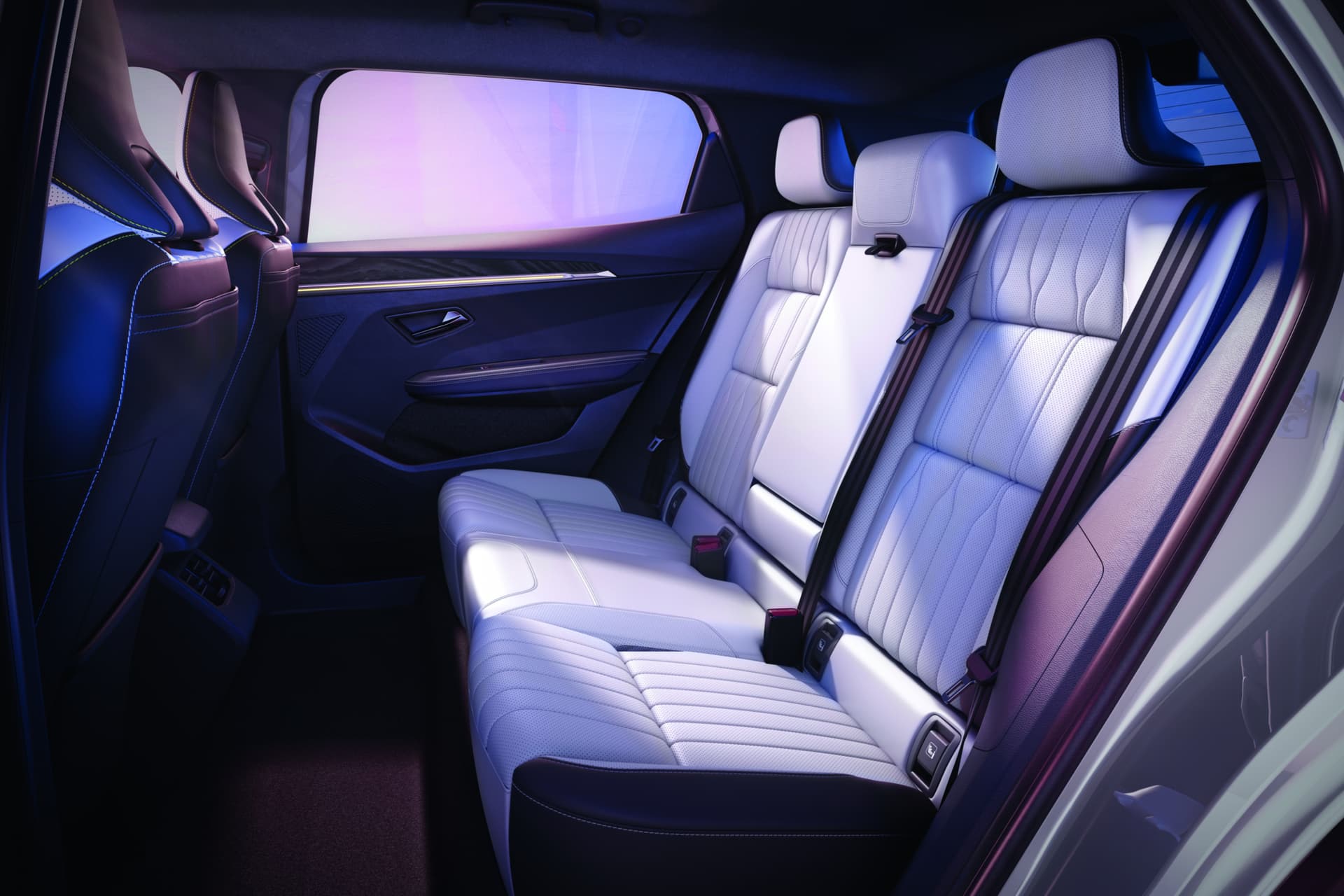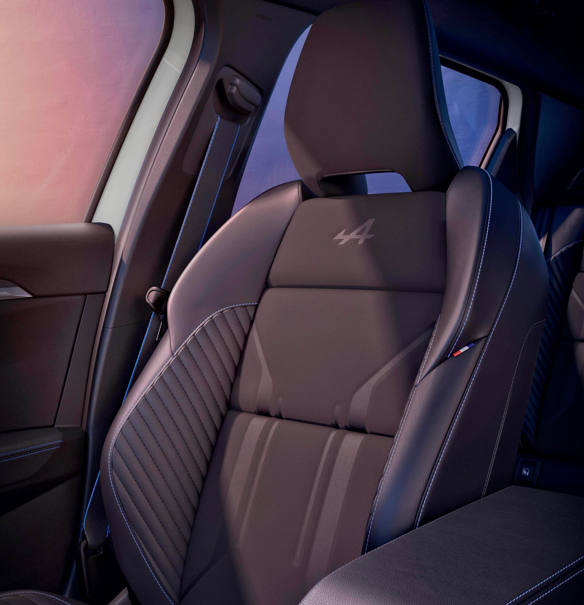 Om du velger utstyrsnivå esprit Alpine, får du sportsseter med titan-sort resirkulert mesh og resirkulert quiltet kornet tekstil med Alpine blå toppsøm.