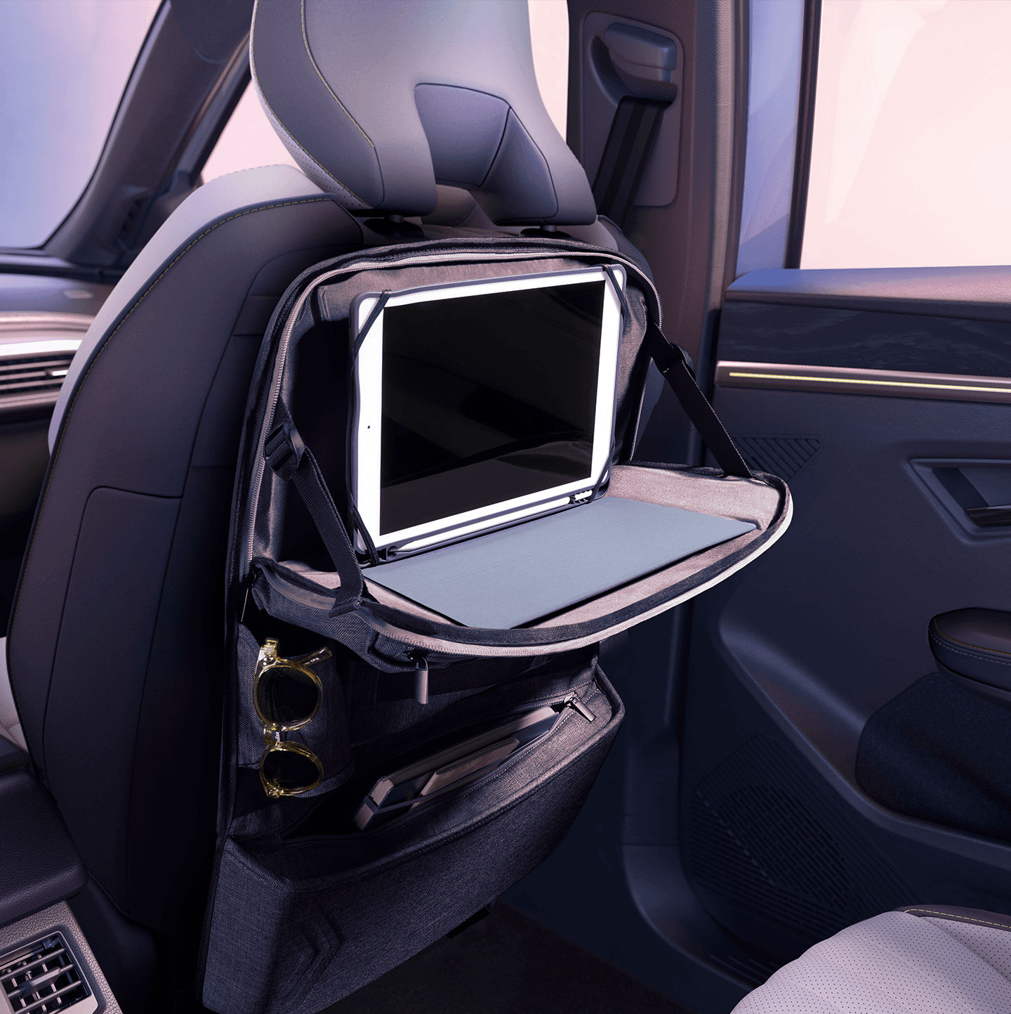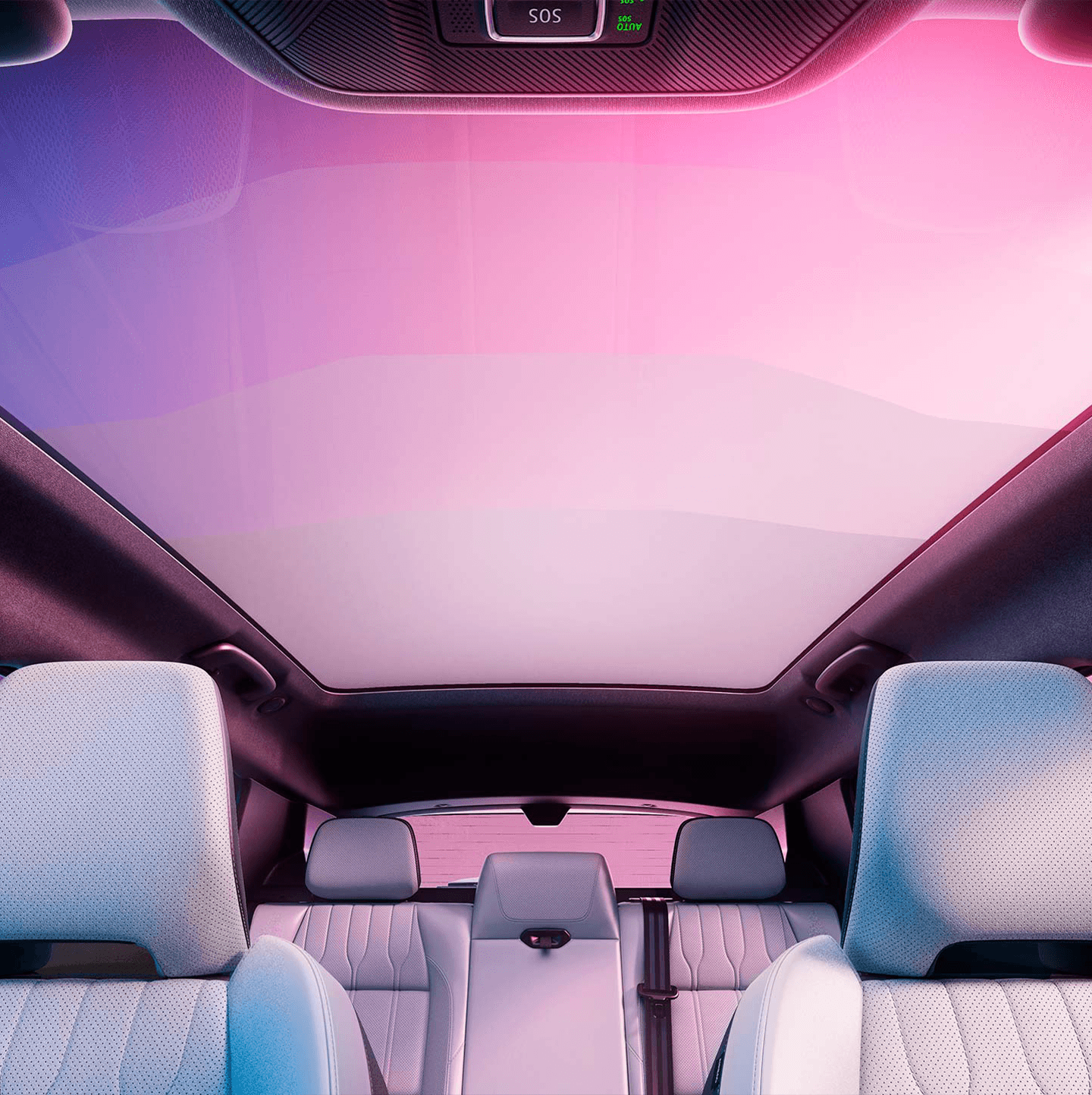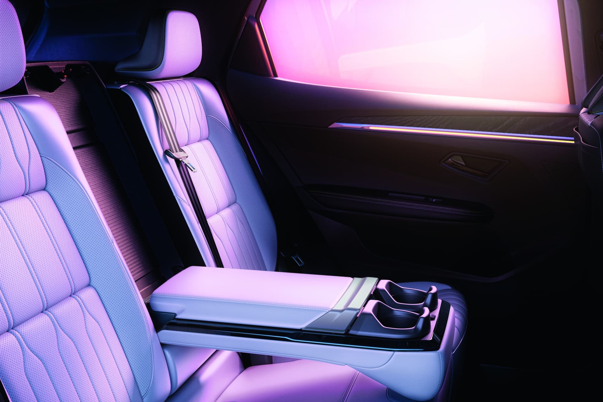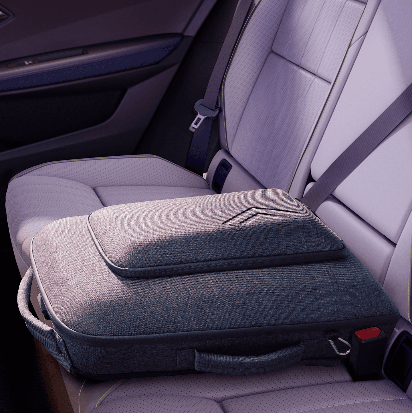 Om du velger utstyrsnivå esprit Alpine, får du sportsseter med titan-sort resirkulert mesh og resirkulert quiltet kornet tekstil med Alpine blå toppsøm.